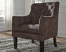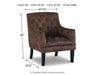 This accent chair with fashion-forward high leg silhouette gives a new meaning to traditional. Diamond button tufting garnishes the back and the plump seat. Distressed fabric with the look of quality leather adds a classic touch that you can appreciate. Mahogany brown color makes it all the more timeless.